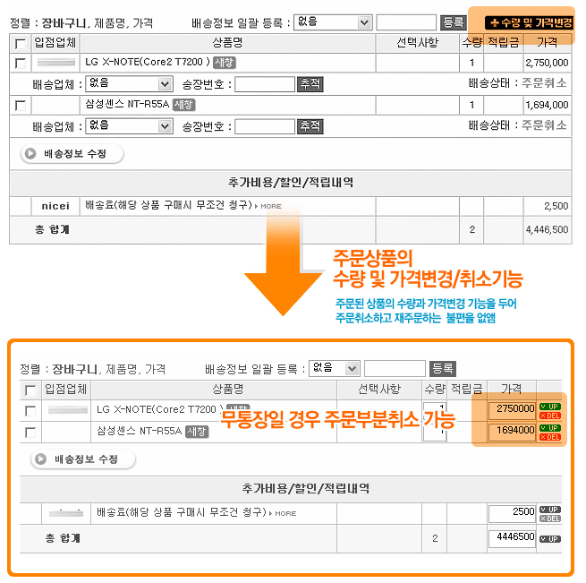 ÁÖ¹®»óǰÀÇ ¼ö·® ¹× °¡°Ýº¯°æ/Ãë¼Ò±â´É - ÁÖ¹®µÈ »óǰÀÇ ¼ö·®°ú °¡°Ýº¯°æ ±â´ÉÀ» µÎ¾î ÁÖ¹®Ãë¼ÒÇϰí ÀçÁÖ¹®ÇÏ´Â ºÒÆíÀ» ¾ø¾Ú |