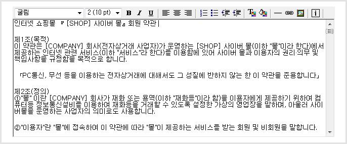 - »óÁ¡ ±âº»Á¤º¸ °ü¸®¿¡ ±âº»Á¤º¸°¡ ÀԷµǾî ÀÖÀ»°æ¿ì ¾à°ü ³»¿ë¿¡¼­ ȸ»ç¸íÀº [COMPANY] ¸ÅÅ©·Î¸¦, »óÁ¡¸íÀº [SHOP] ¸ÅÅ©·Î¸¦ »ç¿ëÇÒ °æ¿ì ÇØ´ç Á¤º¸°¡ ÀÚµ¿ÀÔ·Â µË´Ï´Ù.