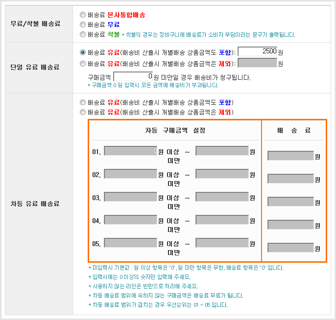 - »óǰ µî·Ï/¼öÁ¤ ÆäÀÌÁö¿¡¼­ °³º°¹è¼Ûºñ¸¦ »ç¿ëÇÒ °æ¿ì ÇØ´ç »óǰÀº Ãß°¡·Î °³º°¹è¼Ûºñ°¡ û±¸ µË´Ï´Ù.